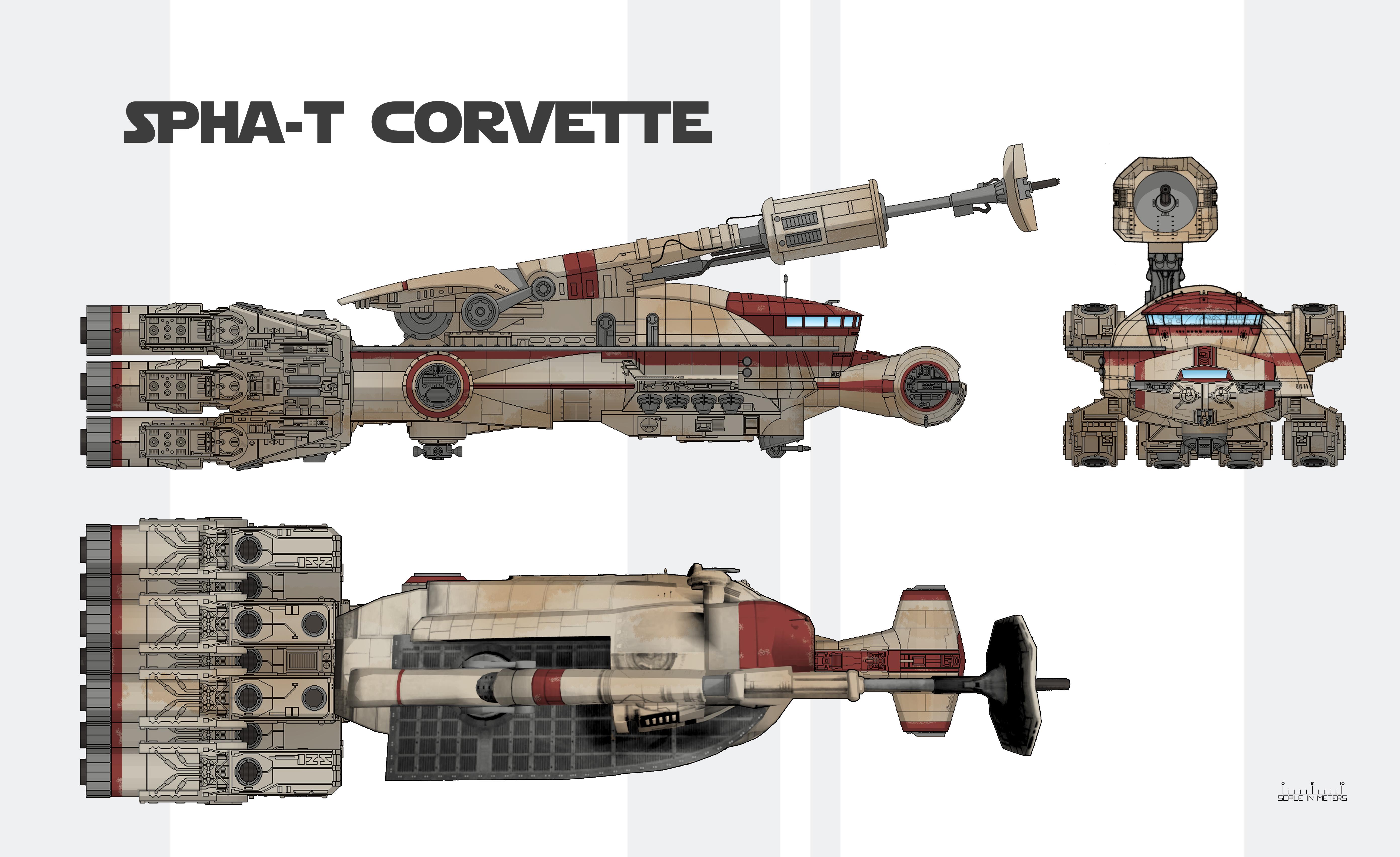 Indirectly inspired by the Galactic Empire's Exactor-class Cruiser, the SPHA-T Corvette was designed to give the Mahporeem Imperial Remnant the ability to engage enemy capital ships at long range, without having to resort to swarms of starfighters or close range engagements. Based on a Clone Wars era design, the SPHA-T Corvette contains a highly unusual Heavy Turbolaser system rarely, if ever, found on a vessel of its size.
